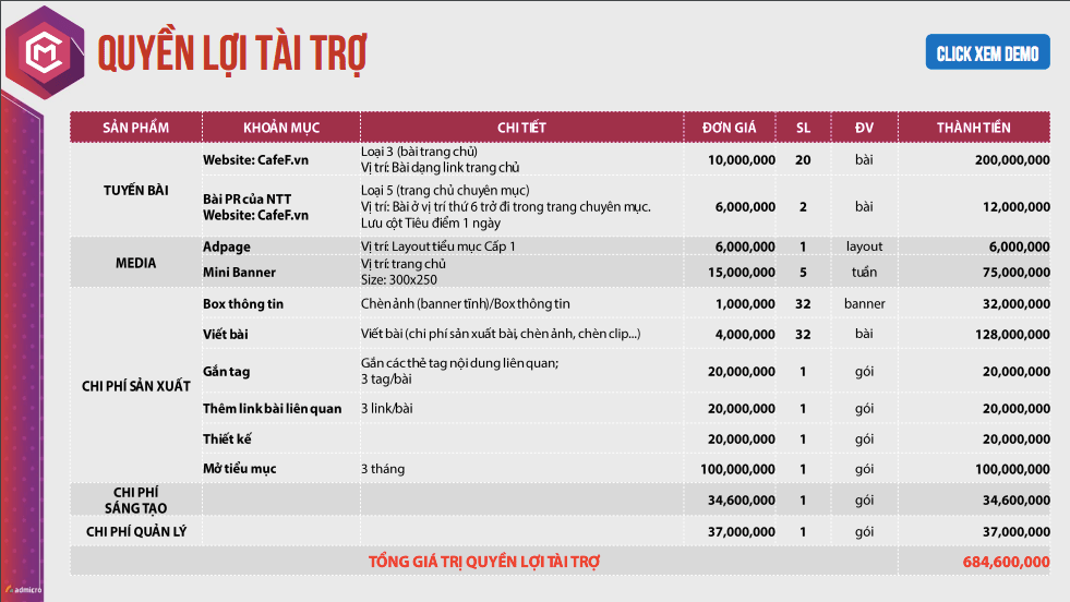Quyền lợi truyền thông nhận được: 684.600.000 VND (tiết kiệm 26%)