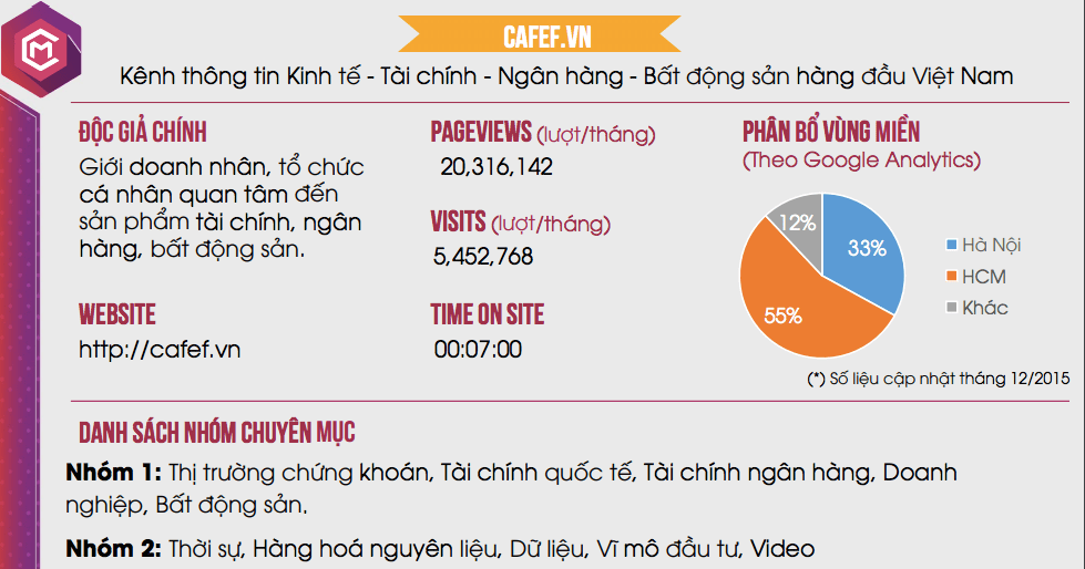 Lượt người xem mỗi tháng trên CafeF ở mức rất cao lên tới hơn 20,3 triệu và tỷ lệ Time on site rơi vào khoảng 7 phút. CafeF phù hợp với những doanh nghiệp ở những thành phố lớn như Hà Nội hay Hồ Chí Minh khi mà phân bổ tại hai thành phố này lần lượt là 55% và 33%, ở các tỉnh thành khác chiếm 12%.