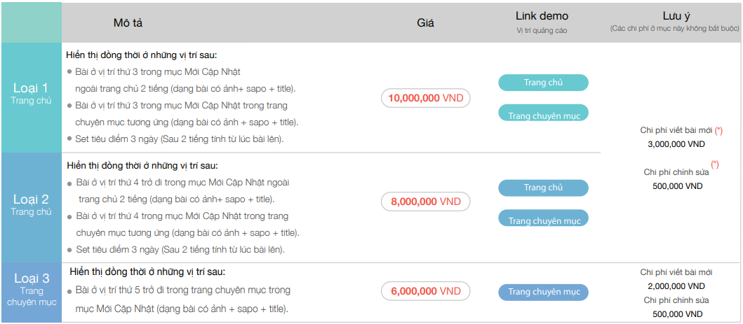 Chi phí viết bài mới: Là chi phí biên tập viên viết bài khi khách hàng đã cung cấp đầy đủ mọi thông tin liên quan tới bài viết. Chi phí này không bao gồm: công tác phí, phí thu thập thông tin và chi phí sản xuất bài viết. – Chi phí chỉnh sửa: Là chi phí biên tập viên chỉnh sửa, biên tập lại nội dung bài PR cho phù hợp với các tiêu chí của báo.