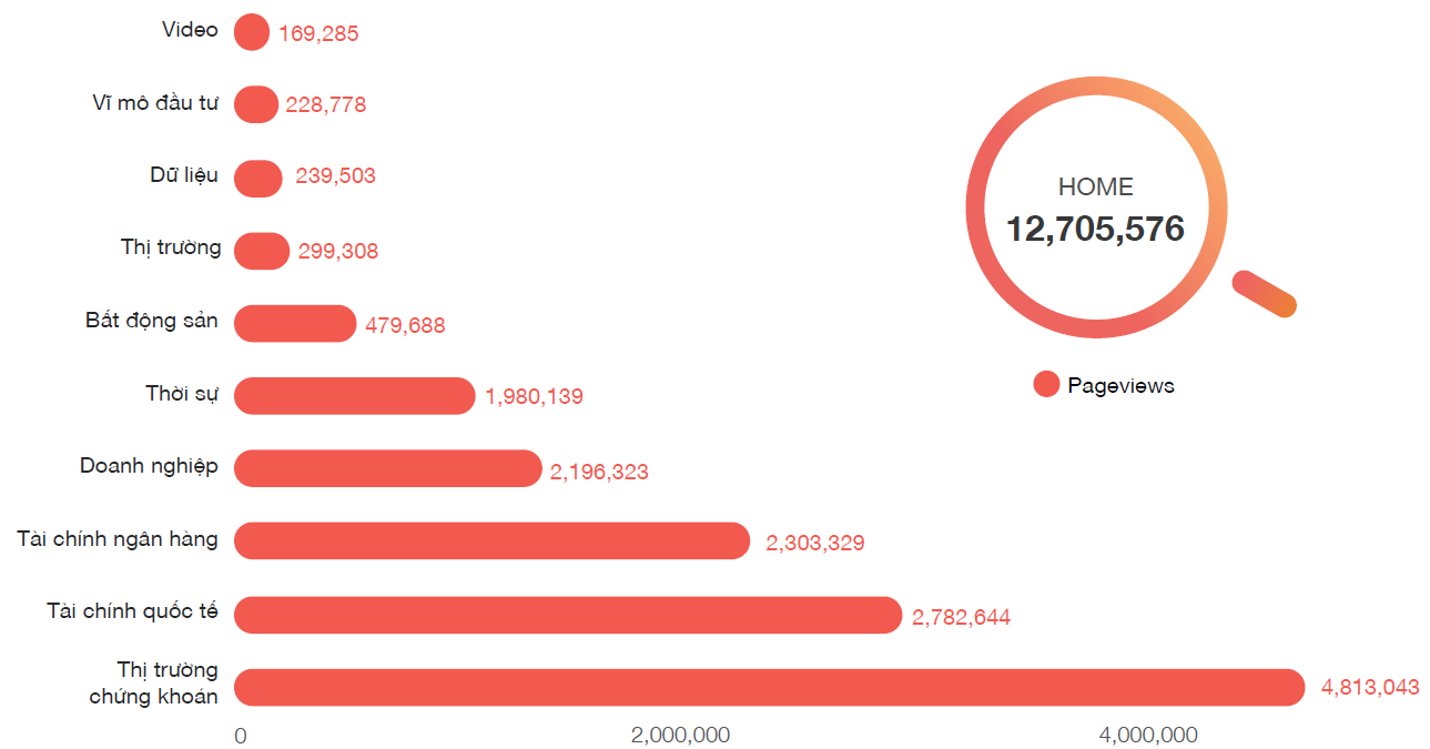 CafeF hiện có 10 chuyên mục, trong đó lượng Traffic lớn nhất đến từ chuyên mục Thị trường chứng khoán. Đây là chuyên mục cung cấp những tin tức nóng hổi nhất về những biến động thị trường chứng khoán trong nước và quốc tế, giúp các độc giả có được những thông tin nhanh chóng, chuẩn xác phục vụ mục đích đầu tư và kinh doanh của mình. Chính vì thế, chuyên mục này đã trở thành chuyên mục “hot” của CafeF với hơn 4,8 triệu PageViews.