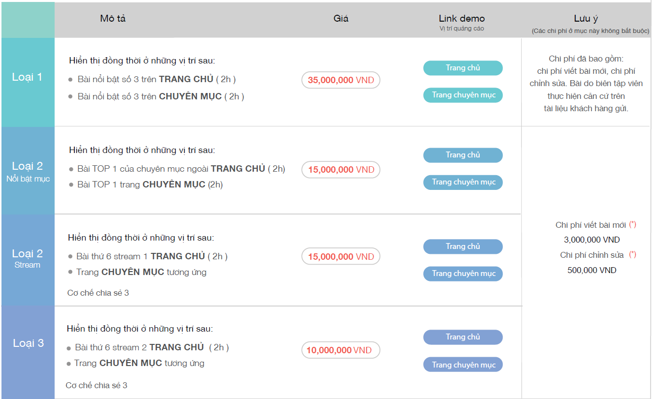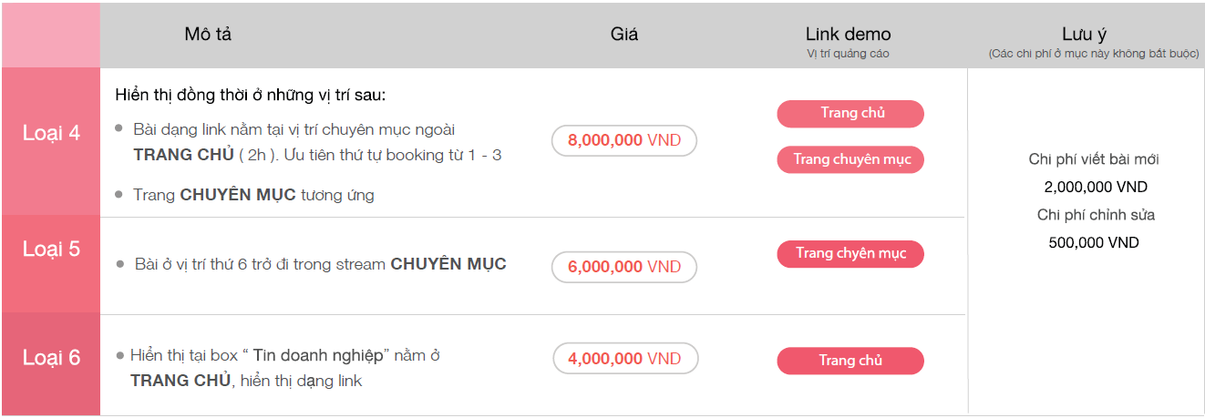Mức ngân sách để quý khách hàng có thể đăng bài PR trên CafeF giao động từ 4.000.000 vnd – 35.000.000 vnd tùy vào các vị trí hiển thị Loại 1, loại 2, loại 3, loại 4, loại 5 và loại 6. Mỗi loại sẽ có vị trí hiển thị và mức giá khác nhau phù hợp với từng nhu cầu và ngân sách của khách hàng với báo giá chi tiết hiện đang được áp dụng như sau:
