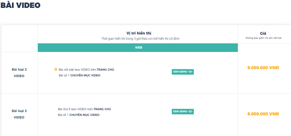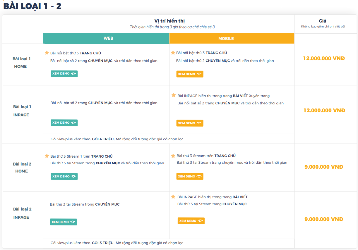 Mức ngân sách để quý khách hàng có thể đăng bài PR trên GenK giao động từ 3.000.000 vnd – 12.000.000 vnd tùy vào các vị trí hiển thị Loại 1, loại 2, loại 3, loại 4, loại 5 và loại video. Mỗi loại sẽ có vị trí hiển thị và mức giá khác nhau phù hợp với từng nhu cầu và ngân sách của khách hàng với báo giá chi tiết hiện đang được áp dụng như sau: