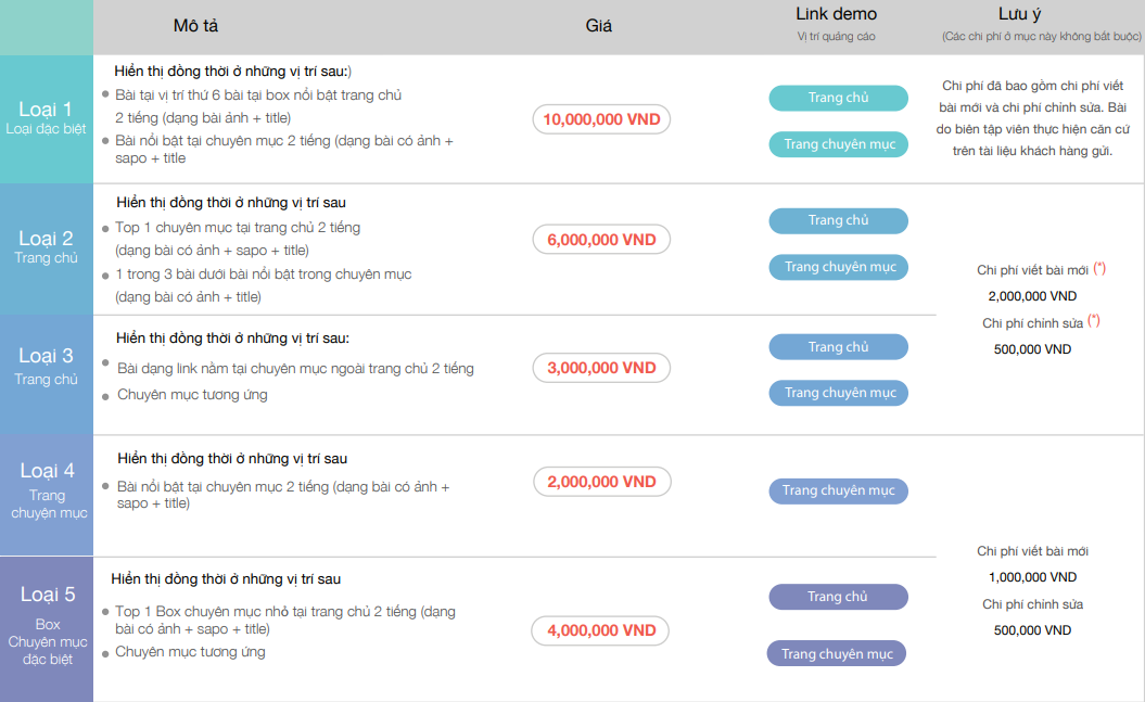 Mức ngân sách để quý khách hàng có thể đăng bài PR trên Giađình.net.vn giao động từ 4.000.000 vnd – 10.000.000 vnd tùy vào các vị trí hiển thị Loại 1, loại 2, loại 3, loại 4, loại 5. Mỗi loại sẽ có vị trí hiển thị và mức giá khác nhau phù hợp với từng nhu cầu và ngân sách của khách hàng với báo giá chi tiết hiện đang được áp dụng như sau: