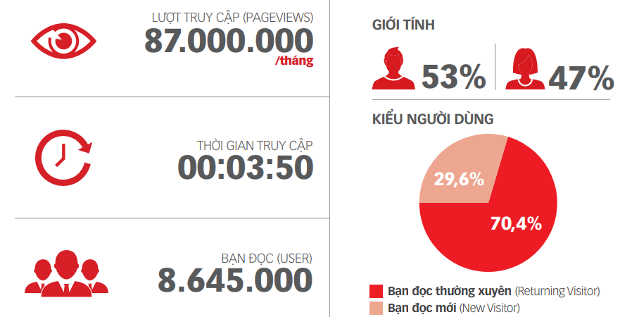 Trong nước, phần lớn độc giả tại miền Nam chiến hơn một nửa lượng truy cập với 53%, miền bắc chiếm 32% và cuối cùng là miền trung với 15%.
