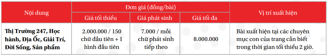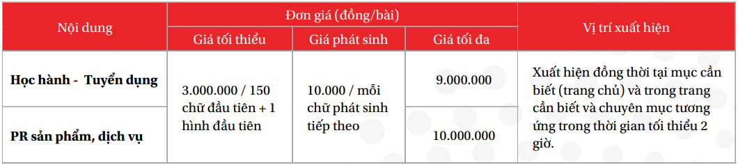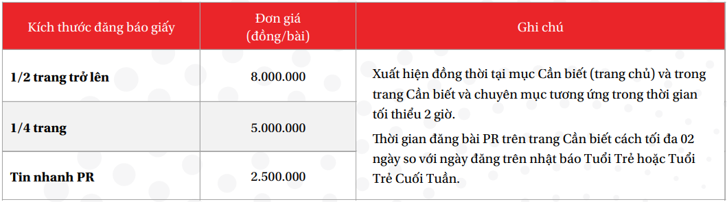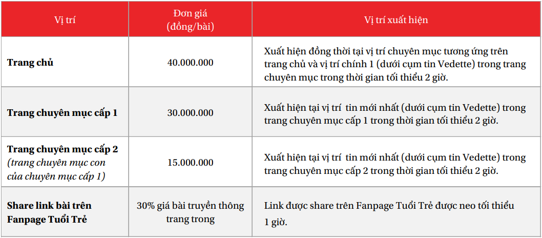 Để các doanh nghiệp nắm được chi phí PR trên báo Tuổi trẻ Online, Vin Ads xin chia sẻ bảng báo giá mới nhất hiện đang được áp dụng như sau: