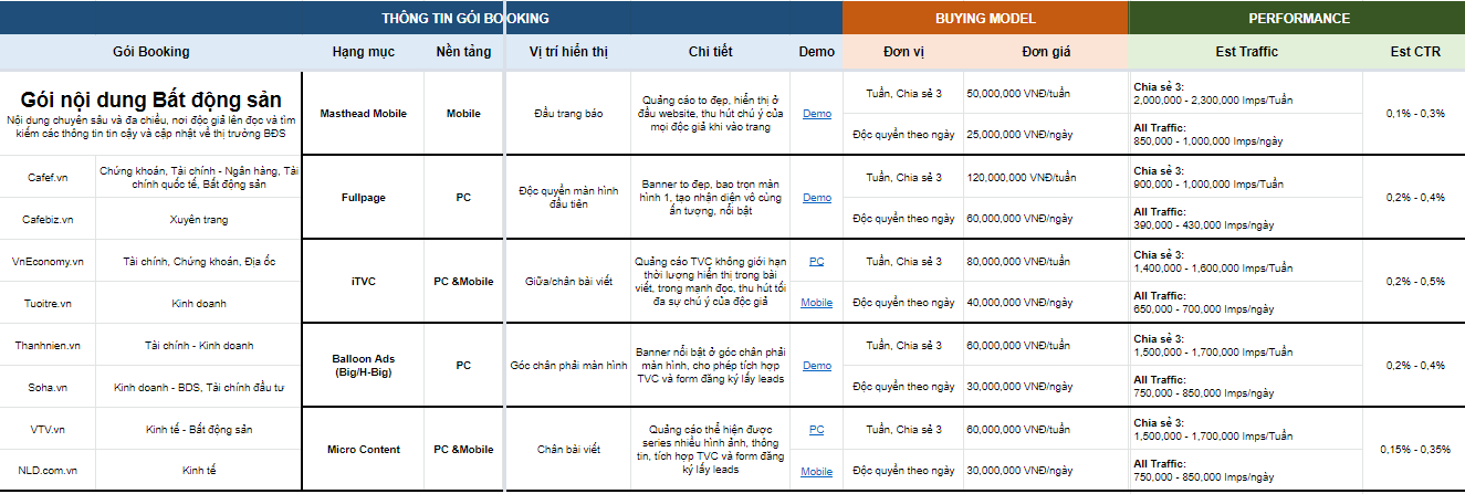 Với gói nội dung Bất động sản, chúng tôi đăng tải quảng cáo trên các nội dung chuyên sâu và đa chiều, nơi độc giả lên đọc và tìm kiếm các thông tin tin cậy và cập nhật về thị trường Bất động sản. Quý khách hàng có thể lựa chọn các trang CafeF.vn, Cafebiz,vn, VnEconomy.vn, Tuoitre.vn, Thanhnien.vn, Soha.vn, VTV.vn, NLD.com.vn. Booking quảng cáo theo gói nội dung bất động sản có báo giá như sau: