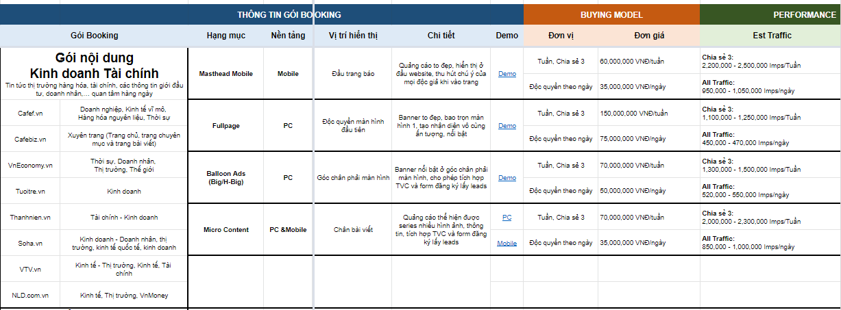 Với gói nội dung Kinh doanh tài chính, chúng tôi đăng tải quảng cáo trên các nội dung tin tức thị trường hàng hóa, tài chính, các thông tin giới đầu tư, doanh nhân,..quan tâm hàng ngày. Quý khách hàng có thể lựa chọn các trang CafeF.vn, Cafebiz,vn, VnEconomy.vn, Tuoitre.vn, Thanhnien.vn, Soha.vn, VTV.vn, NLD.com.vn. Booking quảng cáo theo gói nội dung Kinh doanh tài chính có báo giá như sau: