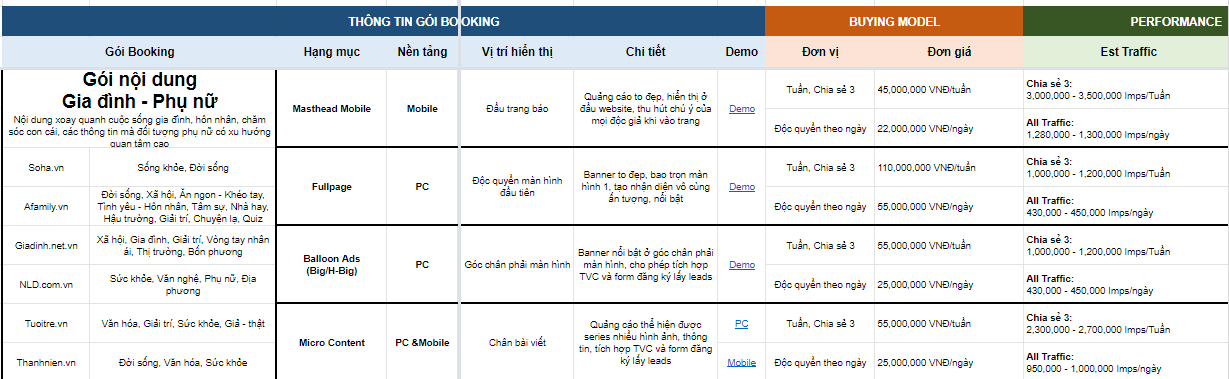 Với gói nội dung Gia đình phụ nữ, chúng tôi đăng tải quảng cáo trên các nội dung cuộc sống gia đình, hôn nhân, chăm sóc con cái, các thông tin mà phụ nữ quan tâm cao – người có tiếng nói mạnh mẽ trong việc quyết định mua nhà. Quý khách hàng có thể lựa chọn các trang Soha.vn, Afamily.vn, Giadinh.net.vn, nld.com.vn, Tuoitre.vn, Thanhnien.vn Booking quảng cáo theo gói nội dung Gia đình phụ nữ có báo giá như sau: