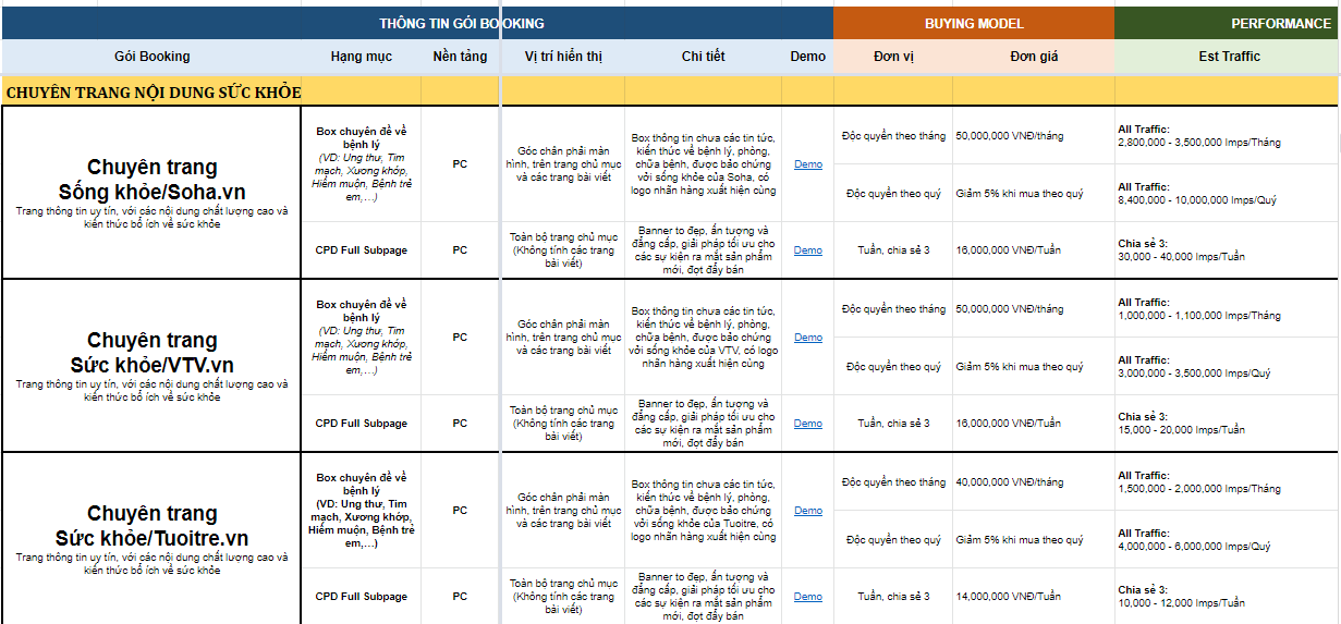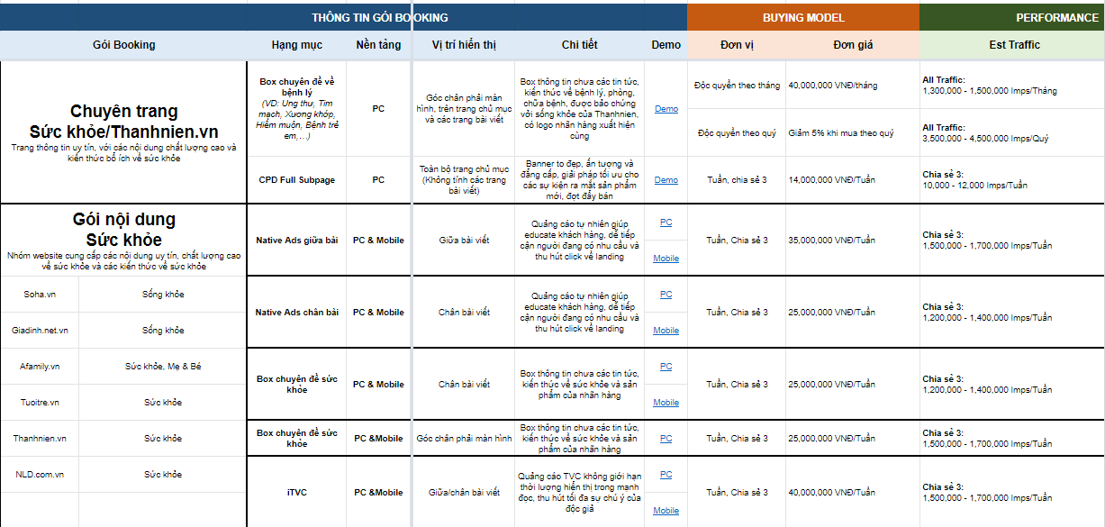 Với cả quảng cáo hiển thị trên cả nền tảng PC và Mobile, quảng cáo trên chuyên trang nội dung sức khỏe có có gói CPD Full Homepage, Masthead Mobile,… với các đặc điểm và báo giá quảng cáo như sau: