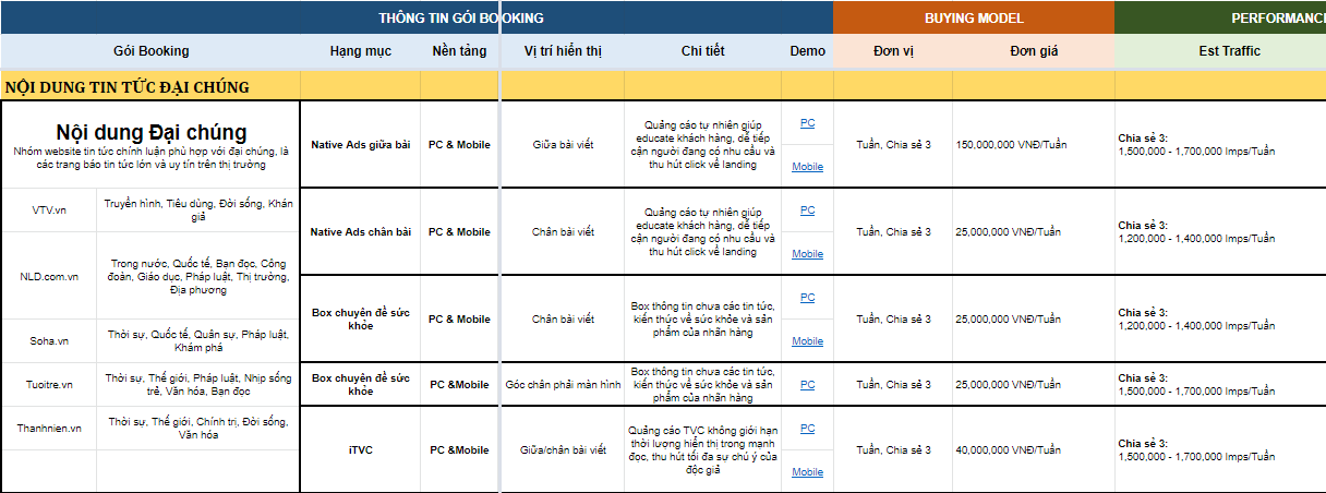 Với nội dung tin tức đại chúng chúng tôi có Nhóm website tin tức chính luận phù hợp với đại chúng, là các trang báo tin tức lớn và uy tín trên thị trường như VTV, NLD, Soha, Tuổi trẻ, Thanh niên,… Với cả quảng cáo hiển thị trên cả nền tảng PC và Mobile, quảng cáo trên chuyên trang nội dung sức khỏe có có gói CPD Full Homepage, Masthead Mobile,… với các đặc điểm và báo giá quảng cáo như sau: