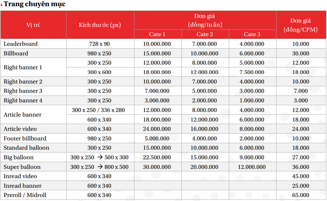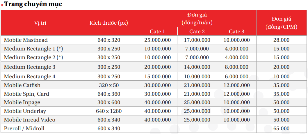 • Medium Rectangle 1, 2 (*): chỉ xuất hiện trang chuyên mục, không xuất hiện trang chi tiết.