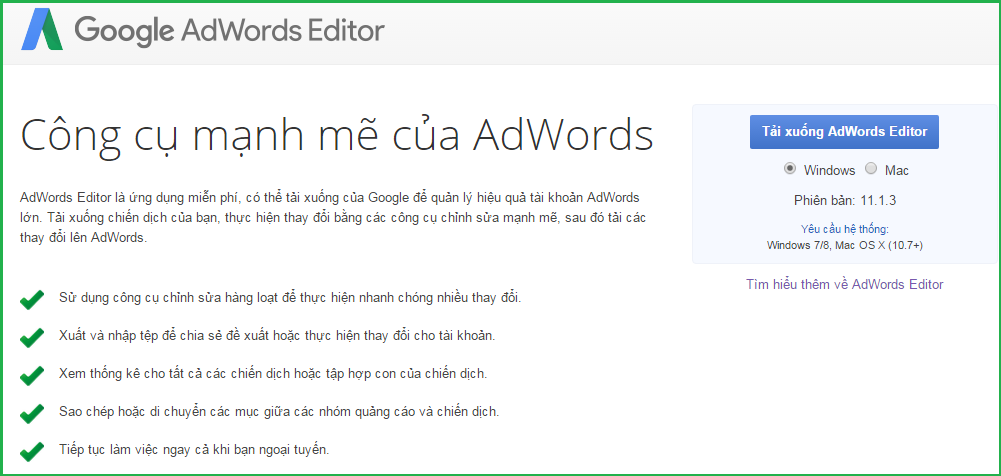 AdWords Editor là một phần mềm miễn phí của Google. Truy cập và lựa chọn phiên bản phù hợp với máy tính của bạn.