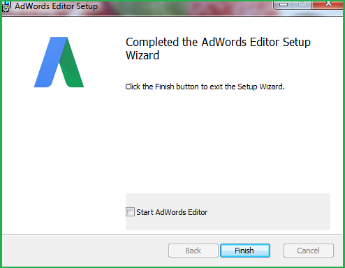 Sau đó, bạn sẽ nhìn thấy hộp thoại như sau. Nếu bạn muốn khởi động AdWords Editor ngay sau khi cài đặt, hãy chọn “Start Google AdWords Editor” và nhấn “Finish”.
