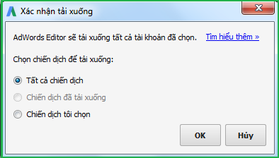 Bước tiếp theo, bạn có thể nhập các chiến dịch AdWords vào phần mềm AdWords Editor. Click đúp vào tên tài khoản và chọn một trong các lựa chọn sau. Ví dụ chúng tôi sẽ chọn “Tất cả chiến dịch”.