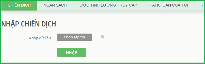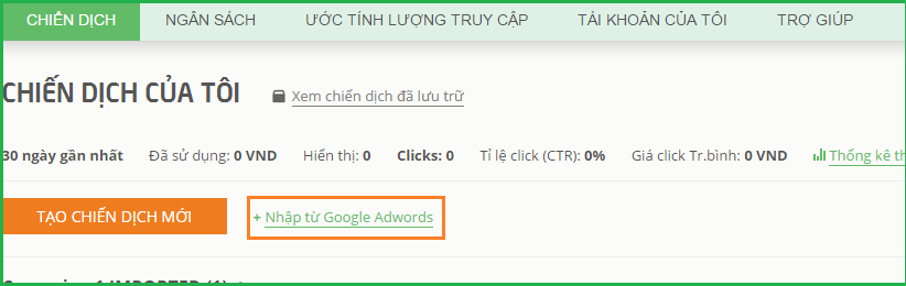 Đây là bước cuối cùng! Hãy đăng nhập vào tài khoản Quảng cáo Cốc Cốc của bạn, nhấn “Nhập từ Google Adwords” để bắt đầu thêm vào Cốc Cốc QC các chiến dịch mà bạn đã xuất thành file trong bước 3.