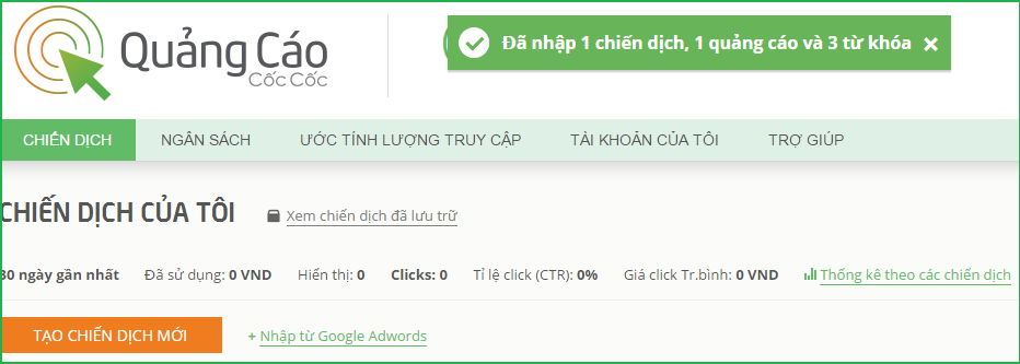Nếu nhìn thấy thông báo về số chiến dịch, số quảng cáo và từ khóa đã nhập như hình, bạn đã thực hiện thành công việc nhập chiến dịch Google AdWords vào Quảng cáo Cốc Cốc.