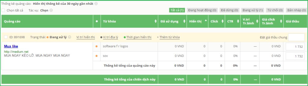 Trong trường hợp từ khóa được bid tại AdWords nhỏ hơn 100 VNĐ (mức tối thiểu của QC Cốc Cốc), giá bid sẽ được tự động chuyển thành “Giá bid đầu trang” ở Google. Trạng thái từ khóa vẫn là “Đang xử lý”.