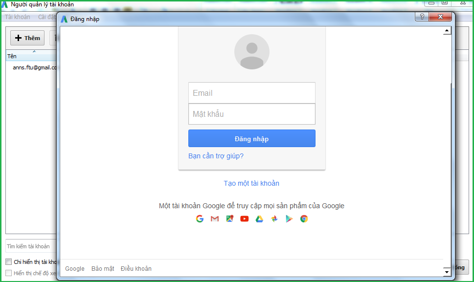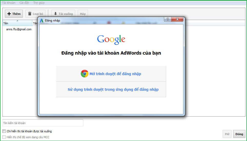 Khi nhìn thấy hộp thoại như ảnh minh họa, bạn có thể đăng nhập Google Adwords bằng cách mở Google Chrome (lựa chọn 1) hoặc đăng nhập ngay trong chương trình Adwords Editor (lựa chọn 2). Ví dụ sử dụng lựa chọn 2: