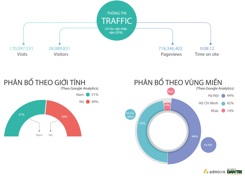 Theo thống kê, mỗi tháng có bình quân Dân trí có 718 triệu pageviews; mỗi tháng có bình quân trên 170 triệu lượt người truy cập vào báo Dân trí với thời gian trung bình trên trang ở mức cao – 8 phút 12 giây. Các độc giả của báo Dân Trí với tỷ lệ nam – nữ gần như tương đương với tỷ lệ nam giới chiếm 51% và nữ giới là 49%. Theo thống kê Traffic phân bổ theo vùng miền, phần lớn lượng Traffic của Dân Trí đến từ 2 thành phố lớn của nước ta là Hà Nội (44%) và Hồ Chí Minh (42%).