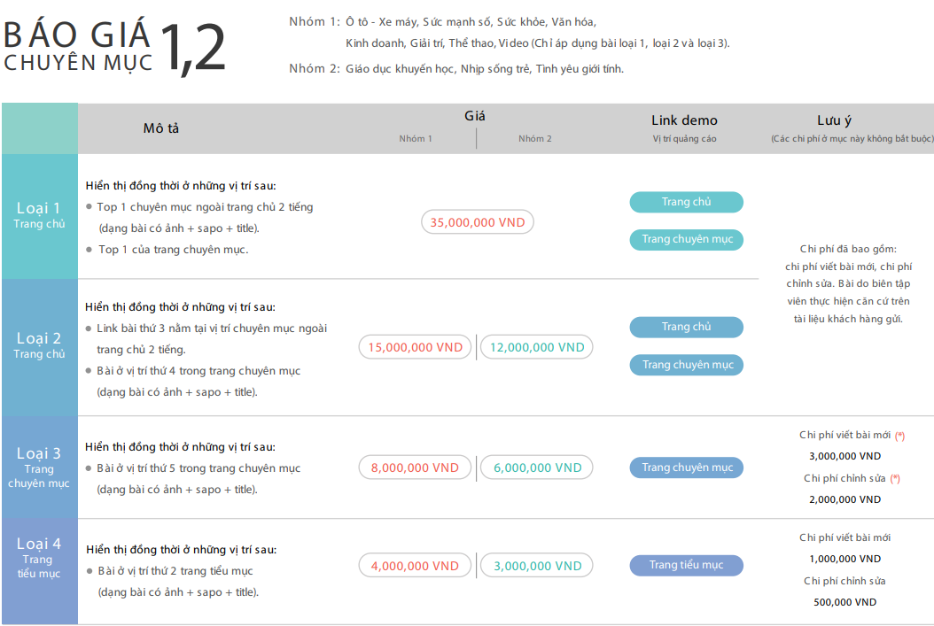 Chi phí quảng cáo trên báo điện tử Dân Trí với chuyên mục nhóm 1 và nhóm 2.