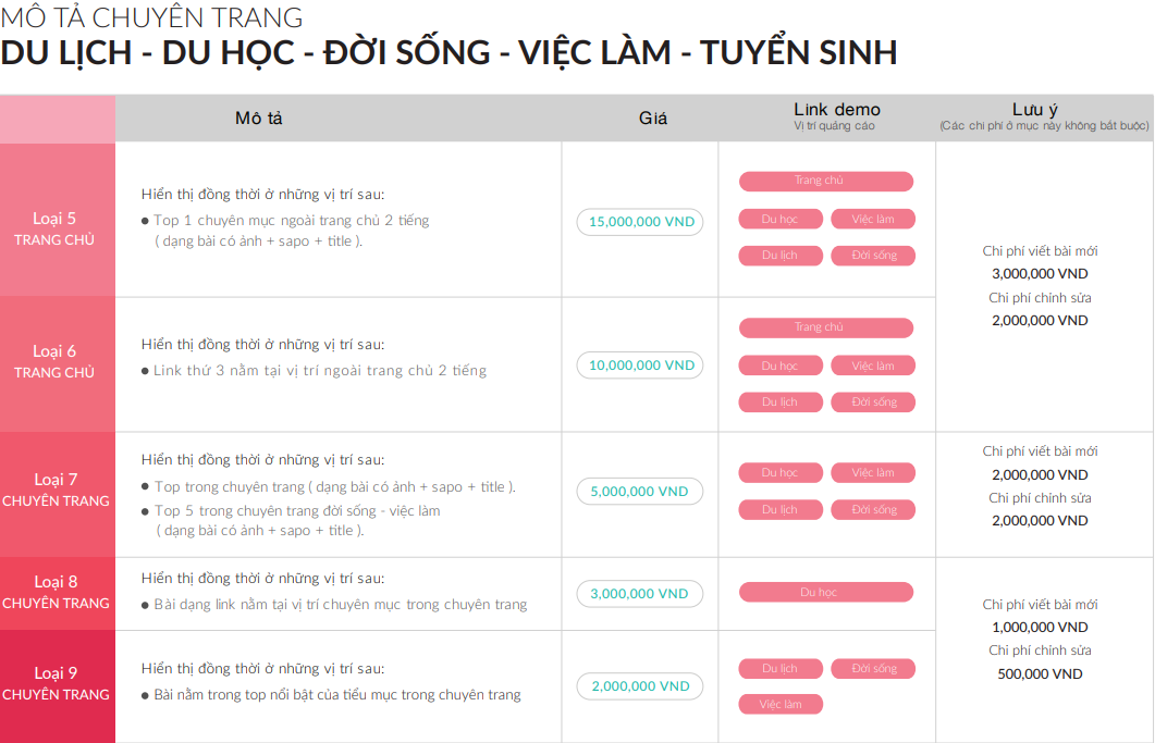 • nhóm 3: chuyên mục Du lịch – Du học – Đời sống – Việc làm – Tuyển sinh.