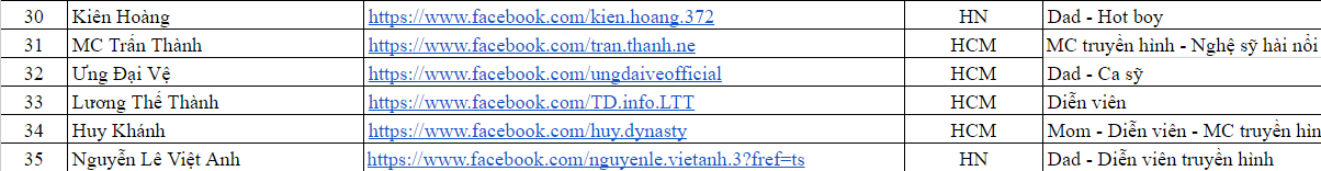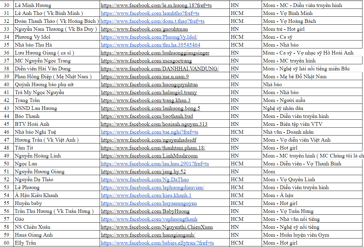 Dưới đây là dnah sách những Celeb hot hiện nay tại Việt Nam bao gồm các ca sĩ, diễn viên, người mẫu,…: