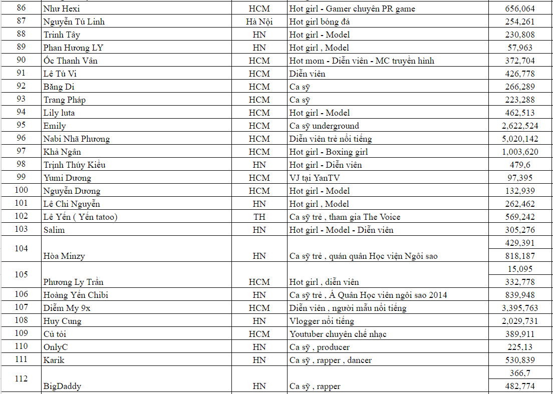 CONTENT MARKETING AGENCY > Dich vụ > Dịch Vụ Kols > Danh sách và báo giá KOLs Việt Nam hot nhất hiện nay