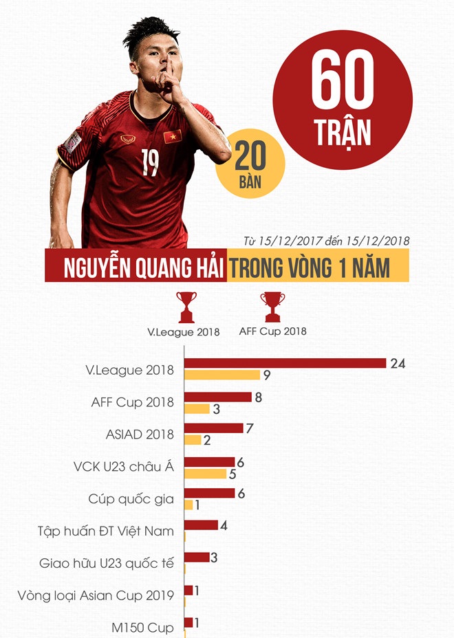 Cùng với chiến thắng chung cuộc – cúp vô địch cùng đồng đội tại giải AFF Cup 2018, Quang Hải đã xuất sắc dành danh hiệu cầu thủ hay nhất giải năm nay do ban tổ chức AFF Cup trao tặng. Trước đó, tiền vệ Quang Hải góp sức tạo nên thành công cùng đội tuyển U23 Việt Nam giành ngôi Á quân giải U23 châu Á, xếp thứ 4 môn bóng đá nam ASIAD 2018, vô địch V.League cùng CLB Hà Nội.