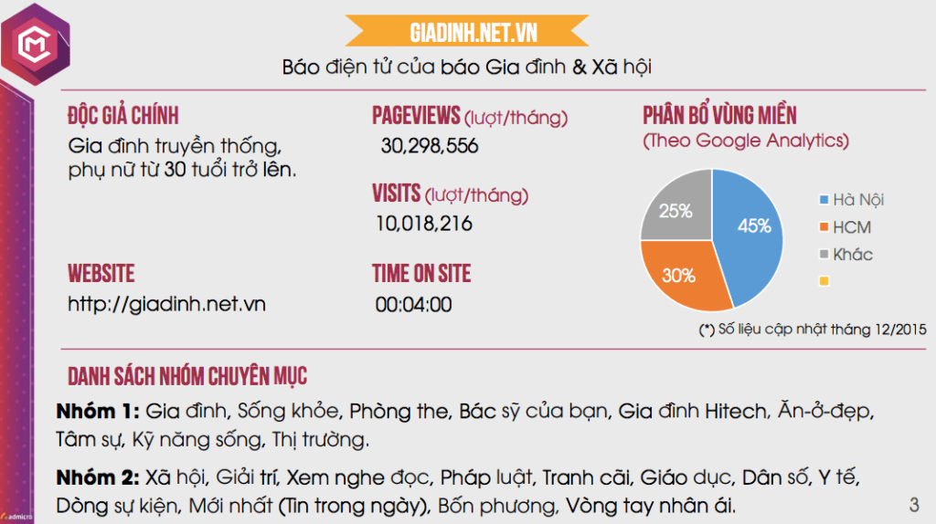 Khi mà Content Marketing đang nhận được sự quan tâm đặc biệt đến từ các doanh nghiệp, hơn thế nó đang là phương tiện để giúp Marketer thực hiện chiến dịch của mình thành công. Tài trợ chuyên mục đang là gói giải pháp được các doanh nghiệp tin dùng, chính vì thế Giadinh.net.vn hay kênh tin tức cập nhật liên tục về các vấn đề thời sự, gia đình, xã hội tại Việt Nam và thế giới. Đây là một trang thông tin phù hợp hướng tới các doanh nghiệp nhắm tới đối tượng chính là những người gia đình truyền thống, phụ nữ 30 tuổi trở lên. Hãy cùng tìm hiểu gói tài trợ chuyên mục trên trang báo điện tử Giadinh.net.vn.