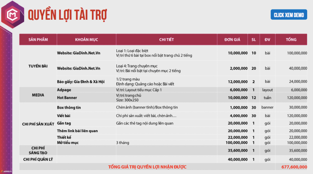 Quyền lợi truyền thông nhận được: 677.600.000 VND (tiết kiệm 26%)