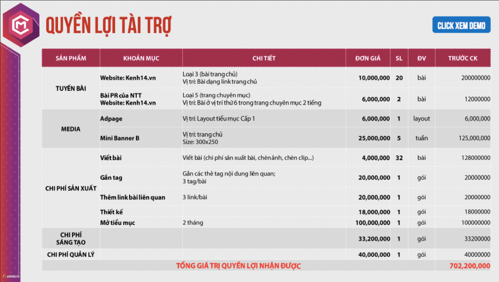 Quyền lợi truyền thông nhận được: 702.200.000 VND (tiết kiệm 28%)