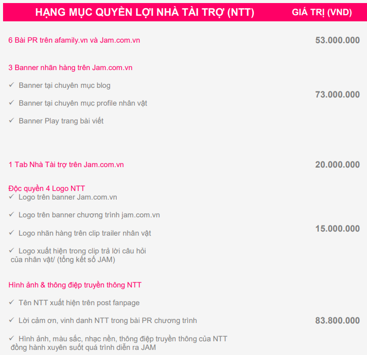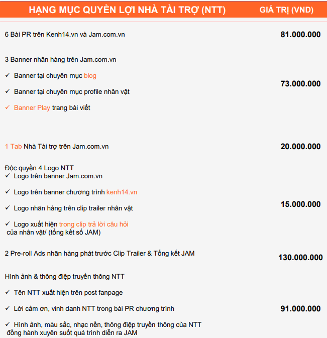 Hạng mục quyền lợi nhà tài trợ và chi phí tài trợ JAM trên Kênh 14 được trình bày chi tiết như bảng dưới đây: