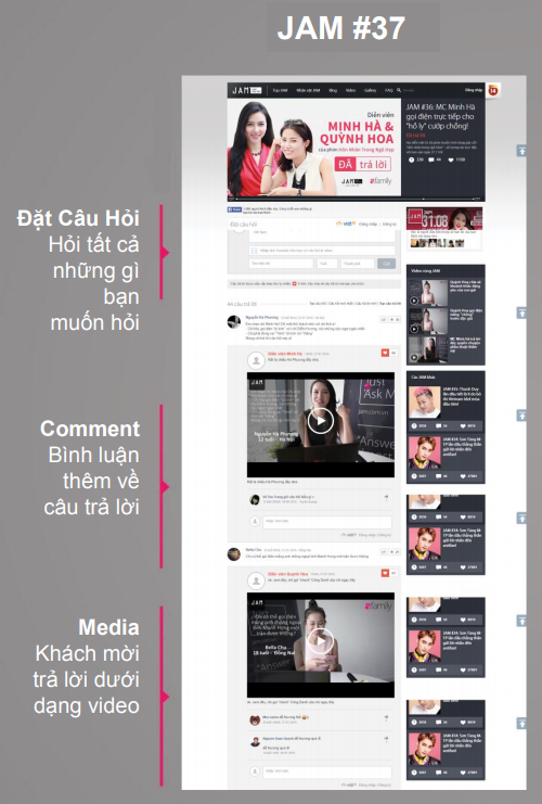 Hơn thế nữa, Tài trợ chương trình JAM Trên Kênh14 và Afamily có thể giúp các thương hiệu tăng tính tương tác với độc giả nhờ PR một cách tự nhiên: Thương hiệu được lồng ghép một cách khéo léo trong các video và câu trả lời. Từ đó, tương tác sâu hơn về mặt cảm xúc với khách hàng, nhờ tạo được sự gắn kết, tin yêu với thương hiệu. Hơn hết sẽ giúp gắn kết & chuyển hoá công chúng mục tiêu thành khách hàng trung thành.