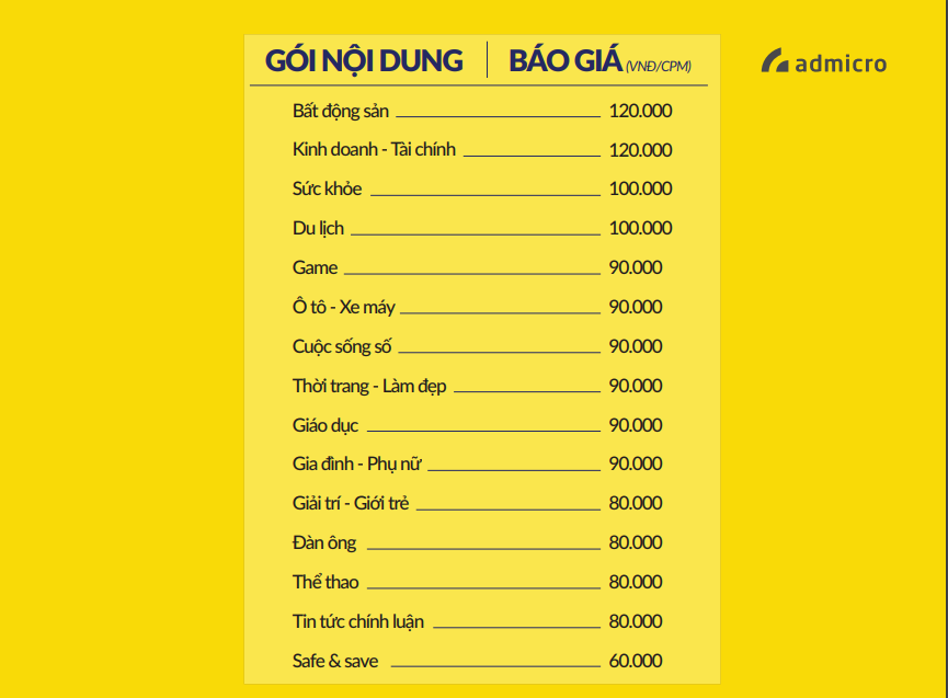 Quảng cáo Full Page của Vinads hiện đang có báo giá theo từng gói nội dung cụ thể như sau: