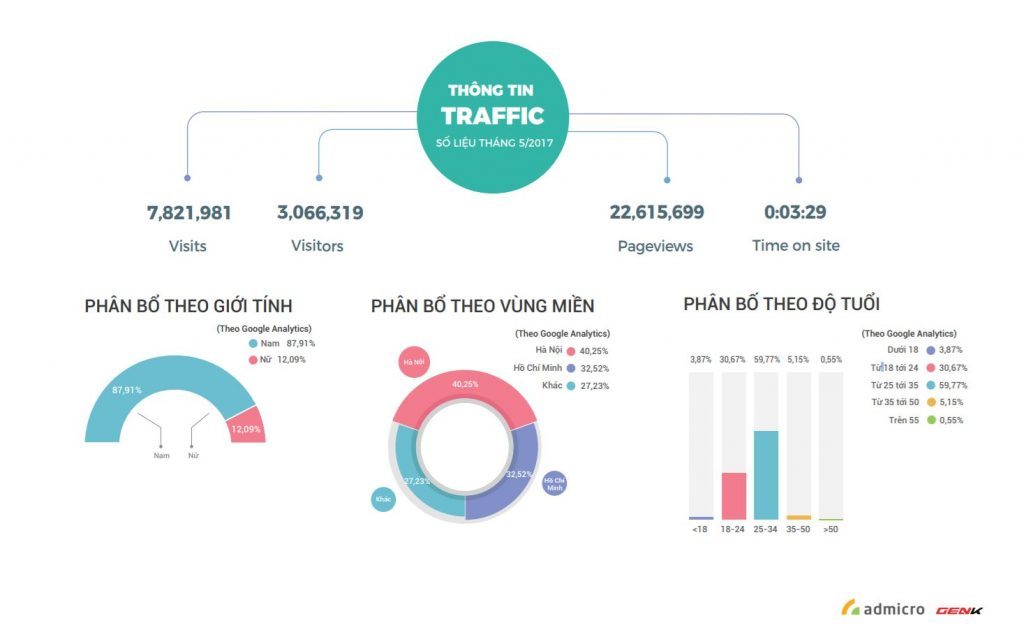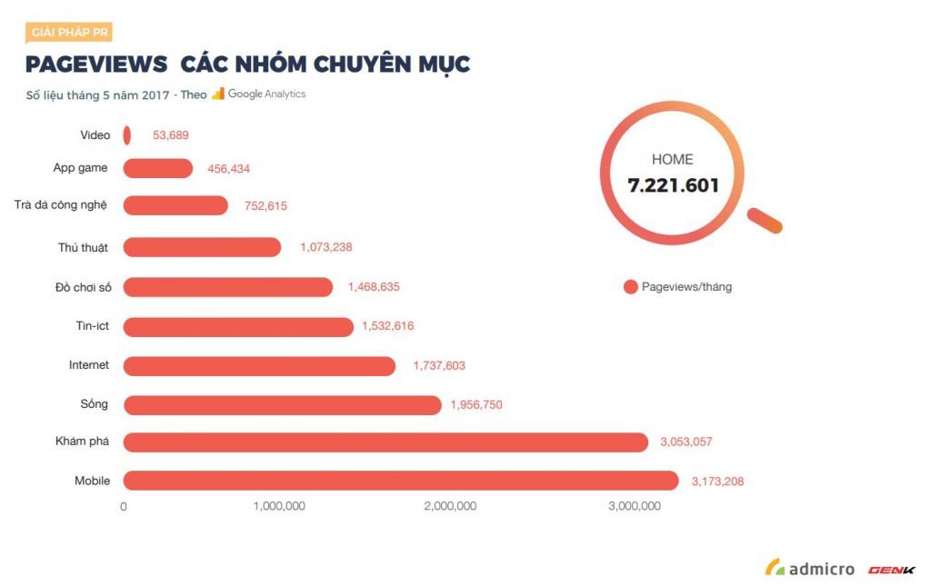 Theo Google Analytics (số liệu tháng 5/2017), GenK đạt Pageview trang chủ là 7.221.601, với thứ tự các chuyên mục theo thứ tự Pageview tăng dần như sau: