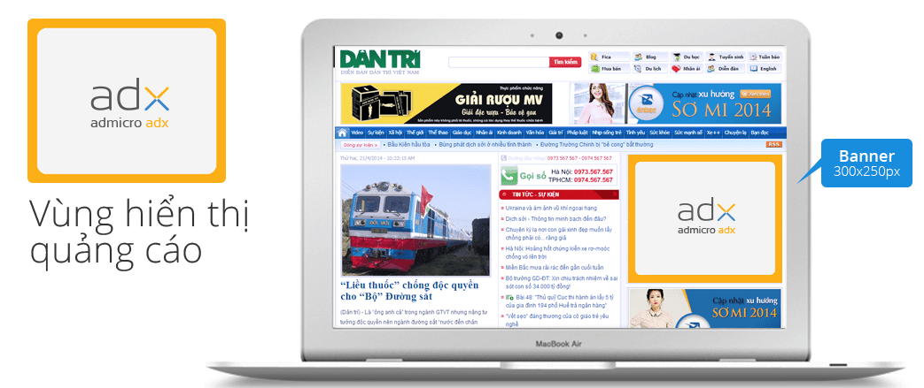 Adx là hình thức quảng cáo banner trên mạng lưới các website của Admarket, bao gồm: Dân Trí, CafeF, Kenh14, trong đó hiện thị trên cả Soha. AdX luôn đem lại rất nhiều lợi ích cho khách hàng. Khi mua quảng cáo này, khách hàng sẽ được: chọn kích thước banner và website đăng banner phù hợp, xác định đối tượng mục tiêu banner cần hướng đến, quản lý, điều chỉnh ngân sách và thời gian chạy banner và cuối cùng, kiểm soát hiệu quả quảng cáo, truy suất báo cáo 24/24…