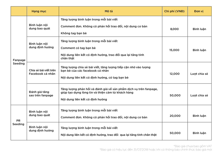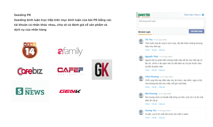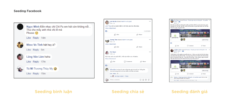 Seeding bình luận: Đây là dạng seeding trên các topic liên quan trên mạng xã hội bao gồm các bài đăng trên group, fanpage, và các facebook cá nhân (để ở chế độ công khai)